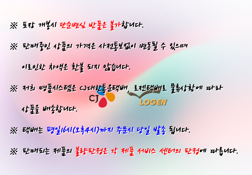 • 상품을 공급 받으신 날로부터 7일이내 단, 가전제품의 경우 포장을 개봉하였거나 포장이 훼손되어 상품가치가 상실된 경우에는 교환/반품이 불가능합니다.